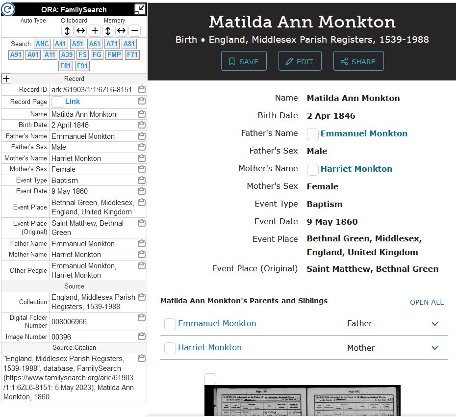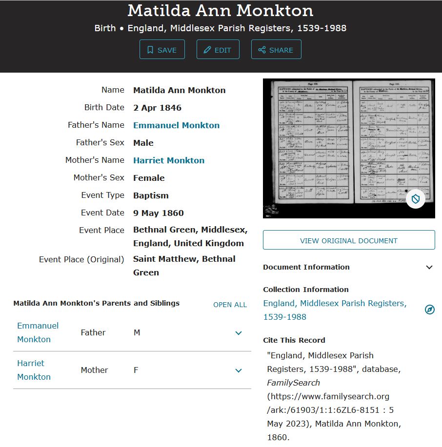 I am going to do a search for the Baptism of Matilda Ann Monkton on Familysearch.org (which is free to use!). We can find her Baptism Record at https://www.familysearch.org/ark:/61903/1:1:6ZL6-8151 Scroll down to see all the info.