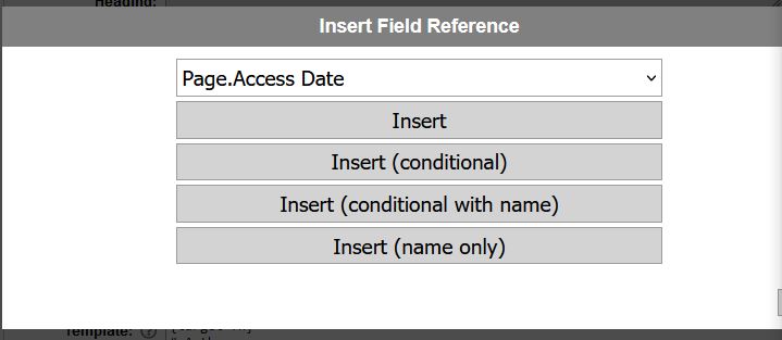 In the Insert Field Reference, click the down arrow in the drop down and select Page.Access Date, and click the Insert button.